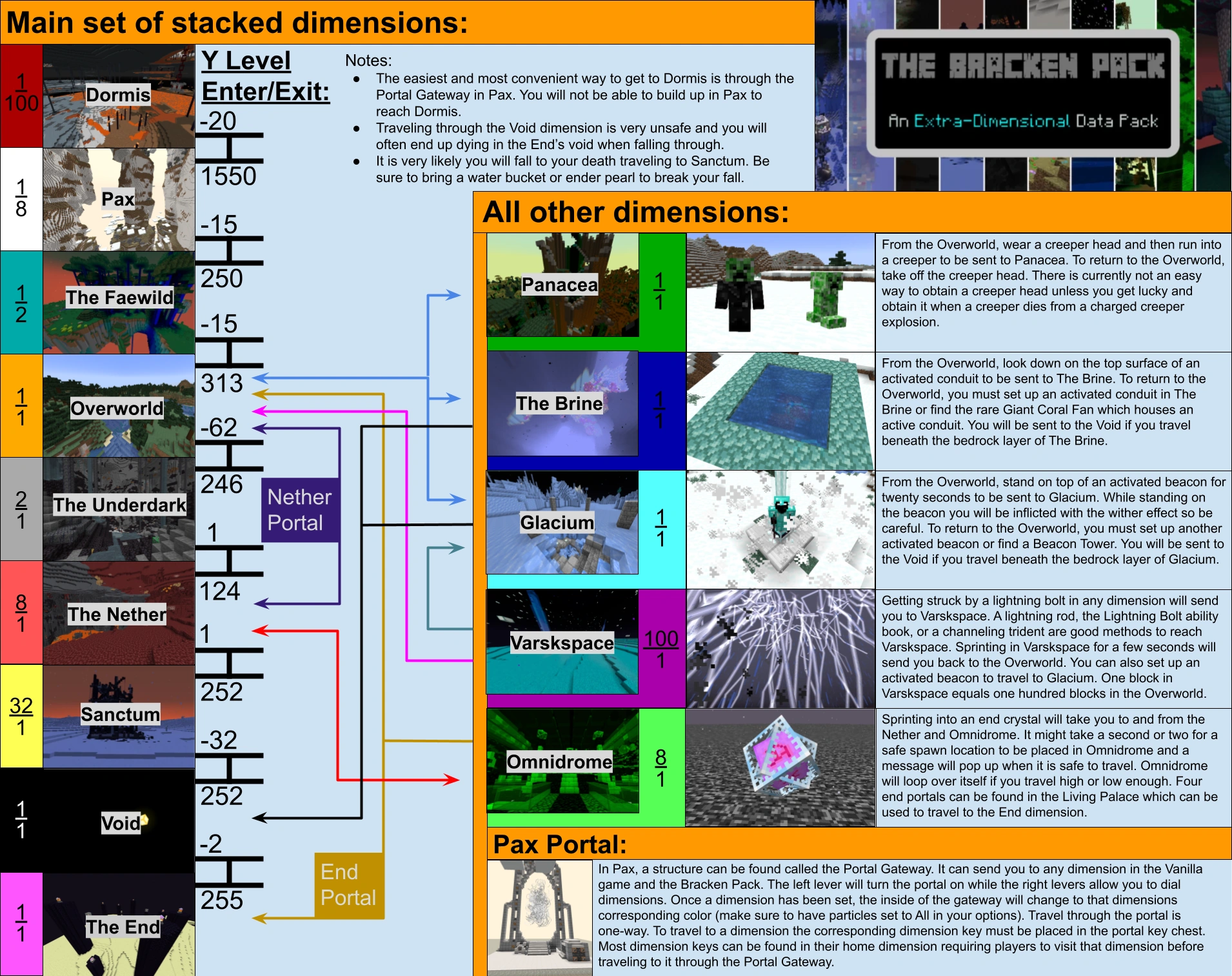 The Bracken pack adds eleven different dimensions in total to find and explore. Each have their own theme and vary vastly from one another. In this article, there will be guides on how to enter each individual dimension, including basic descriptions of each one, and some of the effects each dimension has. If you want more information, click the link/name of the dimension you are curious about for information on the lore, structures, and biomes within each dimension.